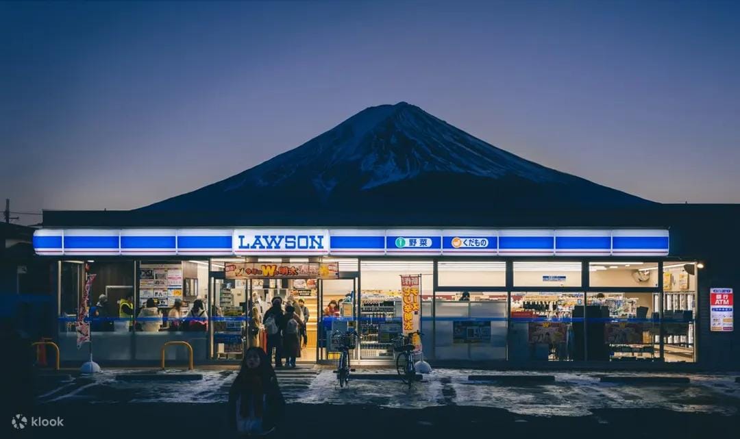 Unique Photography Spots: Capture stunning photos at exclusive locations like the Lawson convenience store in Kawaguchiko, where the modern blue facade contrasts beautifully with Mount Fuji.