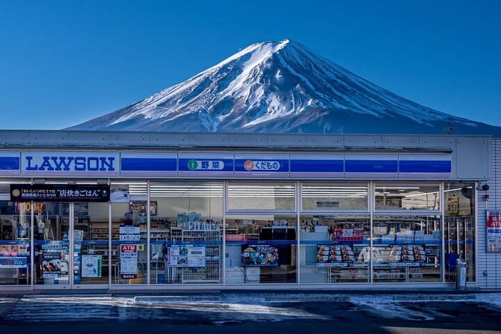 Capture stunning photos at exclusive locations like the Lawson convenience store in Kawaguchiko, where the modern blue facade contrasts beautifully with Mount Fuji.